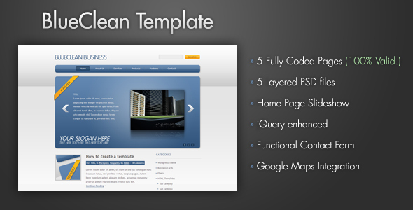 BlueClean is a premium HTML /CSS template most suitable for corporate and professional portfolio sites. Itâs easy to setup and customize so you will have your new professional site up and running in no time! The theme includes: