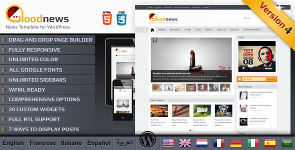 Whats New in 4 : - Unlimited Home/pages layout with new drag and drop page builder - add new elements (news in tabs, news in pictures, new newsbox style) - Merge timthumb and non-timthumb by simple button on options panel - All google fonts inside for headings, content, widgets title, navigation, newsboxes title - add new top alert bar for any kind of notification or any thing such as ads and it fully customizable (content/colors) - add ability for replace the search box with awesome squared social icons - Add ability to make css changes depend on the device (screen/tablet/phone) by new fields in custom css panel - improve the images function for faster loading - General improvements