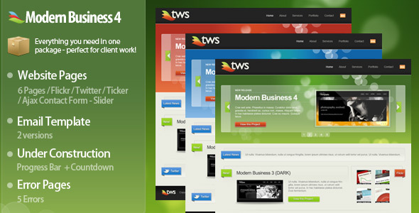 My biggest and best value template package to date, and possibly on ThemeForest. This full collection includes not just your website templates for pages including home, about, contact, portfolio, and services, but also case study pages (requested from buyers) so that you can supply a more detailed view of your project work, 5 error pages written in PHP with menu, under construction page with contact form for updates, and my popular Modern Business 4 Email Template in 2 flavors – regular and campaign monitor ready format. All the above are available in 3 unique colors – green, orange and blue.