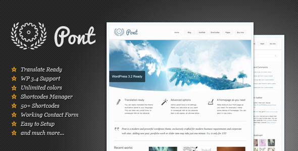 Welcome! Pont is a clean and modern multipurpose WordPress theme with WP 3 .2+ features. There’s many page templates available, unlimited colors, 18 background patterns, 2 slideshow types, 37 included cufon fonts, drag and drop menu builder, sidebar video support, portfolio and slider post types, 50+ shortcodes with shortcode manager and much more.