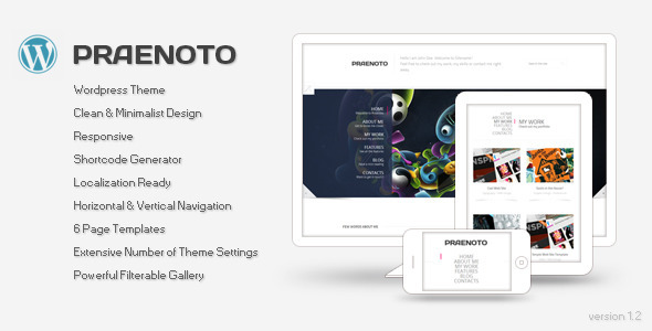 Praenoto is designed to be minimal and clean looking while haveing a lot of features. This theme utilises the most out of WordPress features and makes it perfect for showcasing ones portfolio or being used as blog/magazin. The navigation can be edited to be horizontal or vertical, making it unique and flaxible. This theme is responsive, it adoptes to divices with a smaller screen. Happy blogging!