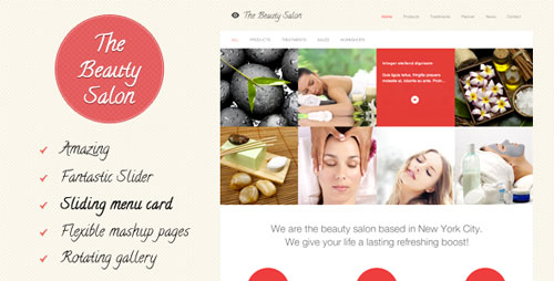The Beauty Salon is created for anyone looking to start their on beauty or healthcare website. This premium theme includes a couple of advanced features such as a sliding menucard with an easy to use menucard buider and a tiled gallery page for treatments, products and services. We’ve made it very easy for you to mash together different kind of pages. Imagine adding galleries, product pages and blogs to any page you want!