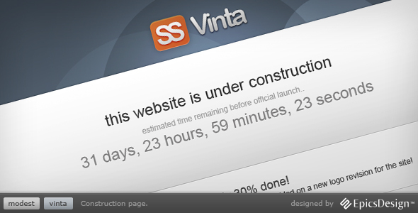 Vinta SS is a simple one page “Under Construction” template that allows you to keep your users informed while you are building a new website. This html template will allow you to quickly and easily create a landing page on a new domain or website project that tells the visitors what is going on and when the site will be completed. Features include: